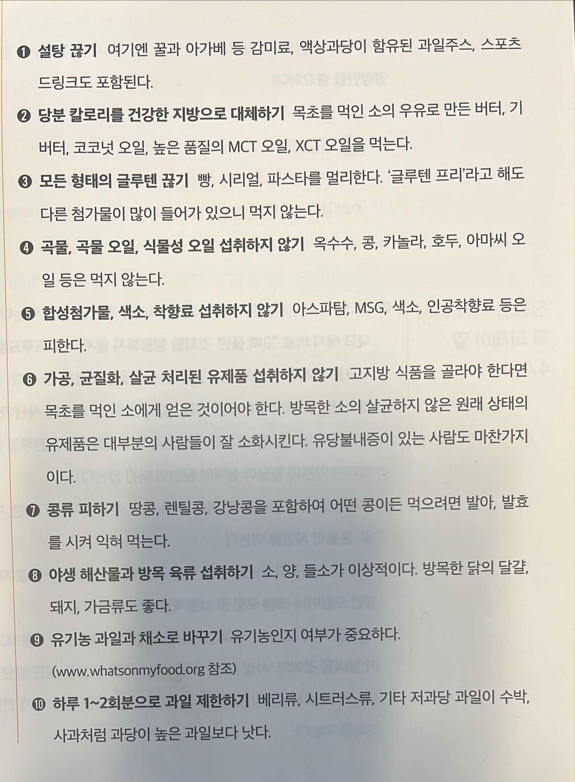 - 기본 완전무결 다이어트; 50-70%(총 섭취칼로리) 건강한 지방+20% 단백질+20% 채소+5% 과일, 녹말